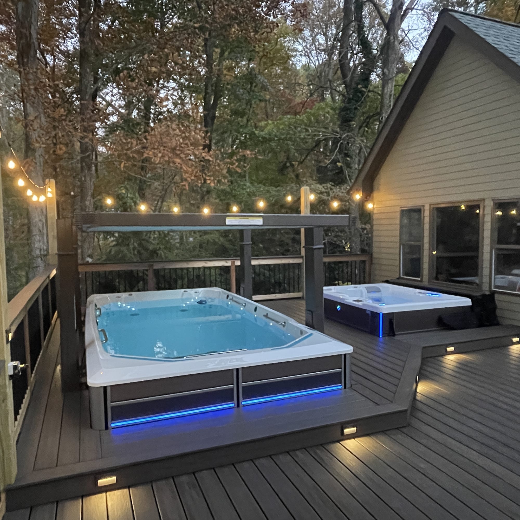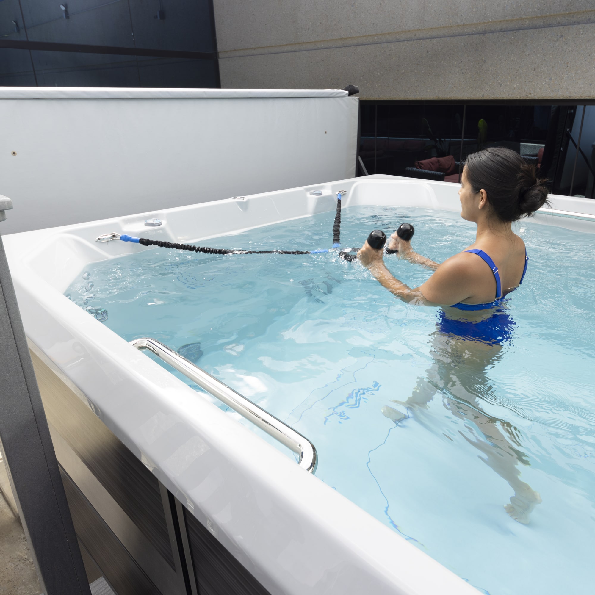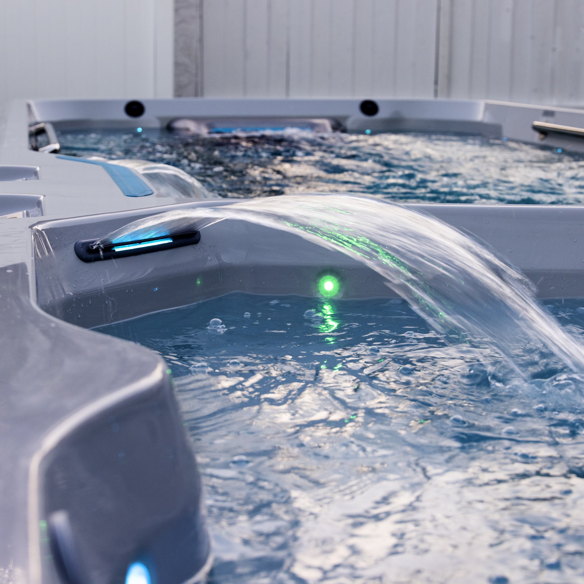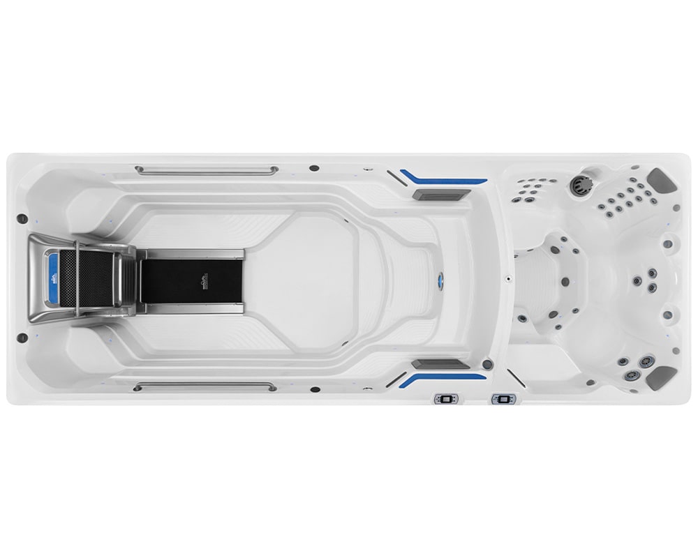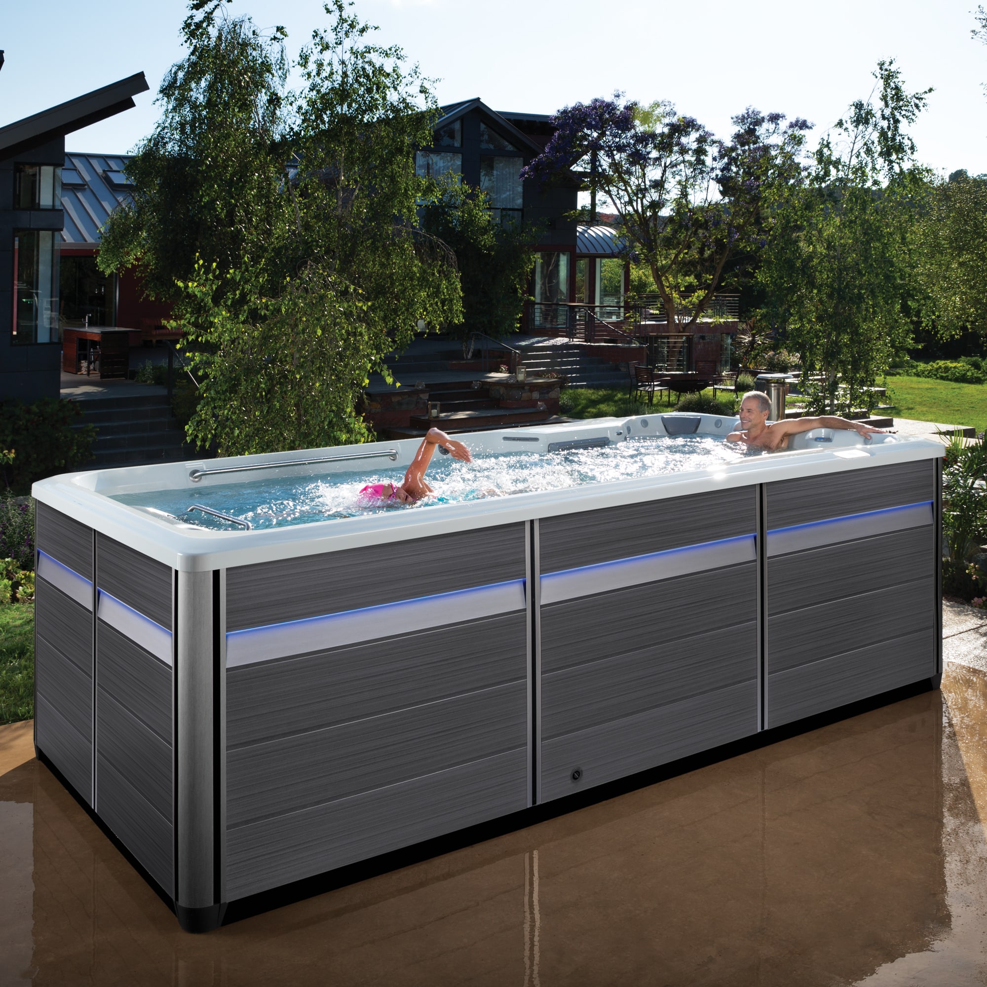 A swim spa combines the benefits of a swimming pool and a hot tub in one compact, energy-efficient unit. You can swim against a steady current for exercise or relax in the warm water for hydrotherapy and recovery.