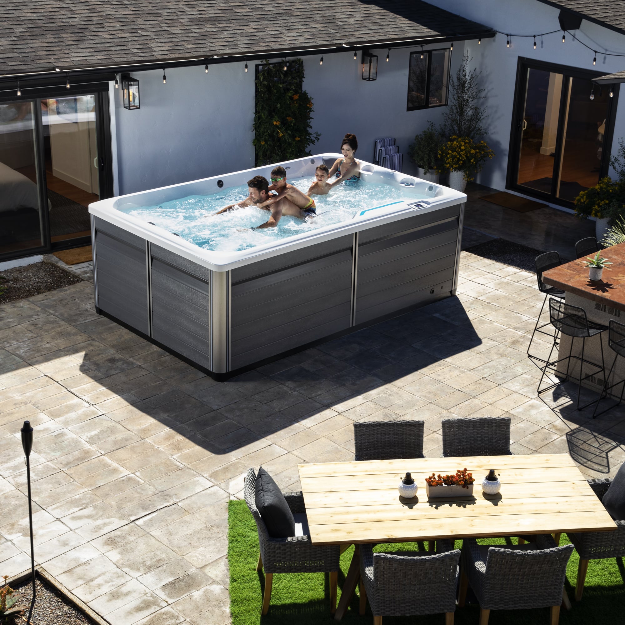 A swim spa combines the benefits of a swimming pool and a hot tub in one compact, energy-efficient unit. You can swim against a steady current for exercise or relax in the warm water for hydrotherapy and recovery.